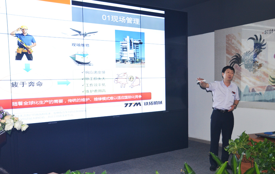 隨后,副總經(jīng)理高岱樂向考察團展示鐵拓機械遠程服務系統(tǒng),分享鐵拓機械服務型制造模式思路。他向考察團介紹到,互聯(lián)網(wǎng)正在改變中國,同時也在改變世界,鐵拓機械想利用互聯(lián)網(wǎng)更好的為客戶做好服務工作。遠程服務系統(tǒng)運營上線,首先改變了傳統(tǒng)的售后服務模式,在機械設備故障發(fā)生時,鐵拓機械技術工程師通過系統(tǒng)就可以了解設備使用情況并及時找到問題,在家解決問題,縮短服務時間和成本,為客戶提供便利。同時該系統(tǒng)還兼具預警功能,通過設備大數(shù)據(jù)分析,對設備核心部件使用情況能夠及時預警,降低設備故障率,降低設備的維護成本。
